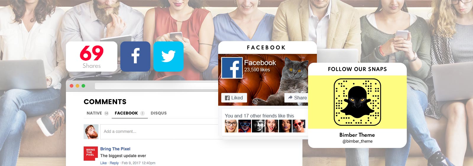 Bimber offers many widgets to help you promote your social media channels: Facebook, Instagram, Twitter, Instagram, YouTube, and even Snapchat.